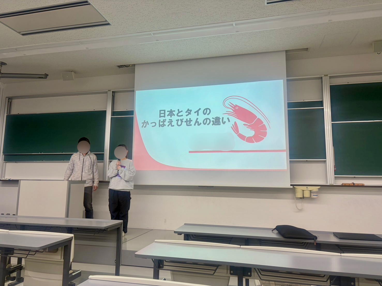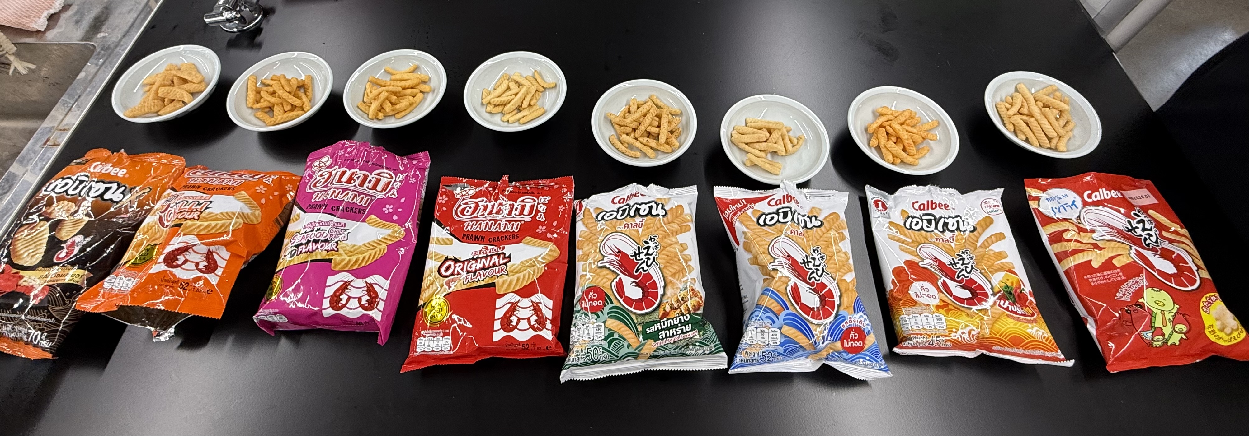 海外ビジネス研修Iの事後学習では、研修前の事前学習で調査した「日本とタイのかっぱえびせんの違い」を基に実際に現地スーパーで購入したタイのえびせんと日本のかっぱえびせんを食べ比べ、分析しました!